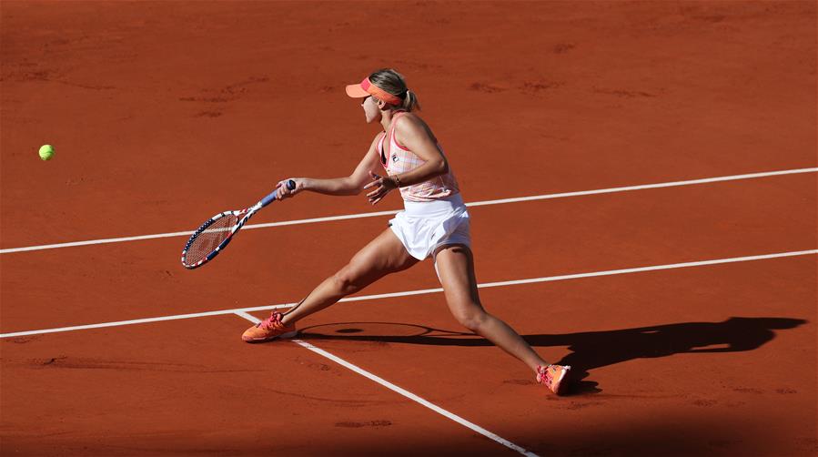 10月7日,克宁在比赛中回球。 当日,在法国巴黎进行的2020年法国网球公开赛女单四分之一决赛中,美国选手克宁以2比1战胜美国选手柯林斯,晋级四强。 新华社记者 高静 摄