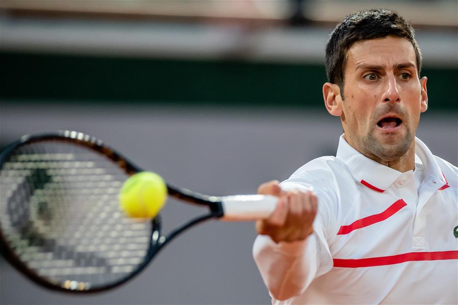 10月7日,焦科维奇在比赛中回球。 当日,在法国巴黎进行的2020年法国网球公开赛男单四分之一决赛中,塞尔维亚选手焦科维奇以3比1战胜西班牙选手布斯塔,晋级四强。 新华社发(奥雷利安·莫里萨尔摄)