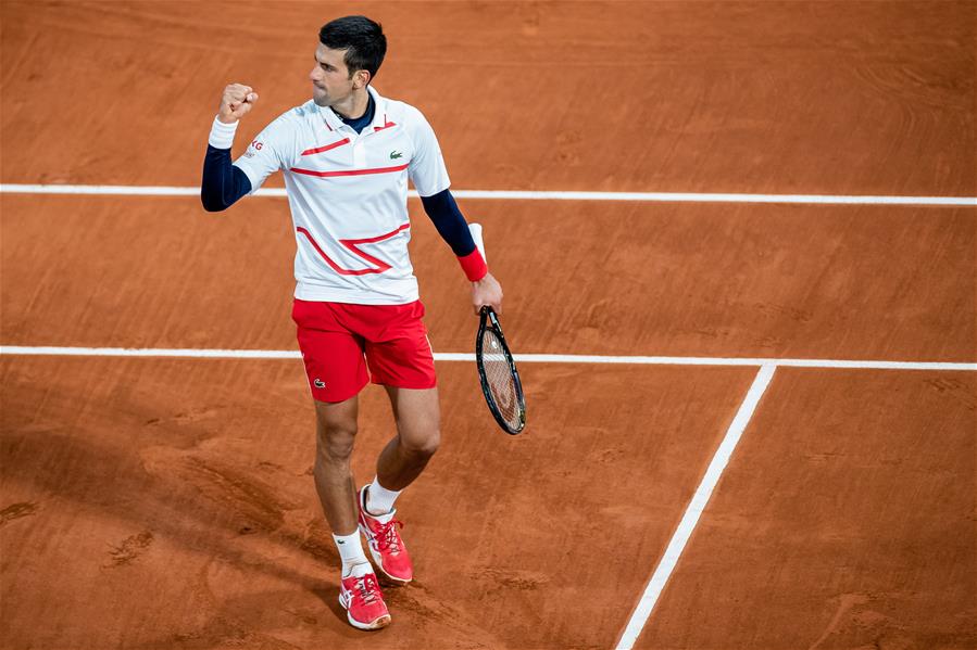 10月7日,焦科维奇庆祝胜利。 当日,在法国巴黎进行的2020年法国网球公开赛男单四分之一决赛中,塞尔维亚选手焦科维奇以3比1战胜西班牙选手布斯塔,晋级四强。 新华社发(奥雷利安·莫里萨尔摄)