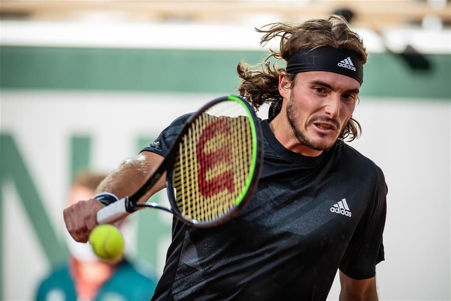 10月7日,西西帕斯在比赛中回球。 当日,在法国巴黎进行的2020年法国网球公开赛男单四分之一决赛中,希腊选手西西帕斯以3比0战胜俄罗斯选手鲁布廖夫,晋级四强。 新华社发(奥雷利安·莫里萨尔摄)