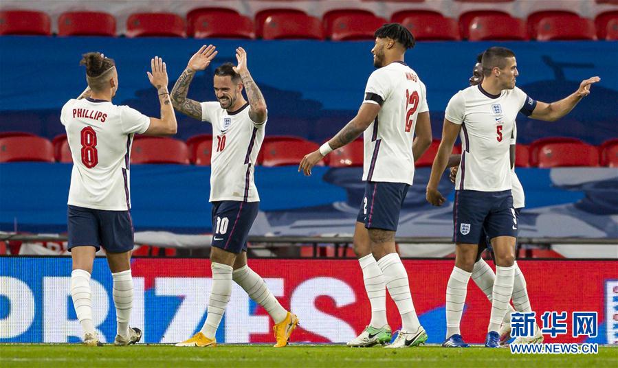 10月8日,英格兰队球员英斯(左二)在进球后与队友庆祝。 当日,在英国伦敦进行的一场国际足球友谊赛中,英格兰队以3比0战胜威尔士队。 新华社发