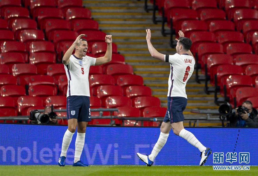 10月8日,英格兰队球员科迪(左)在进球后与队友庆祝。 当日,在英国伦敦进行的一场国际足球友谊赛中,英格兰队以3比0战胜威尔士队。 新华社发