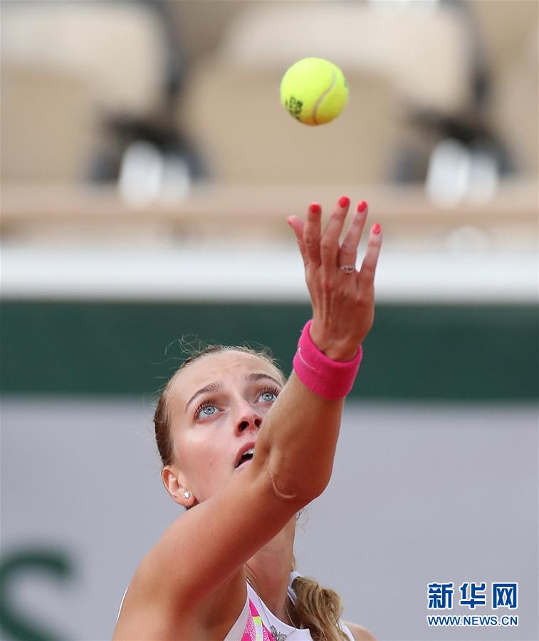 10月8日,科维托娃在比赛中发球。 当日,在法国巴黎进行的2020年法国网球公开赛女单半决赛中,捷克选手科维托娃以0比2不敌美国选手克宁,无缘决赛。 新华社记者高静摄