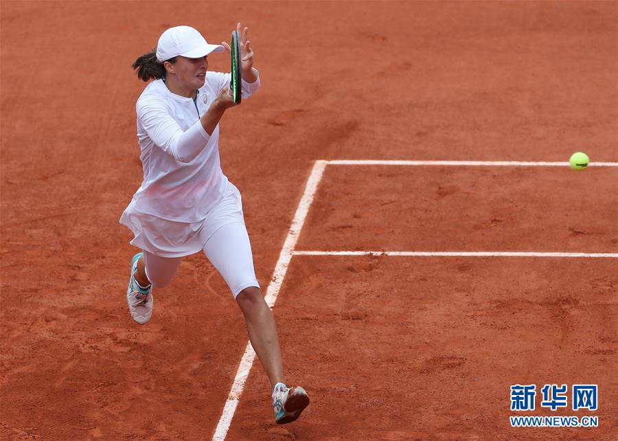 10月8日,斯维亚特克在比赛中回球。 当日,在法国巴黎进行的2020年法国网球公开赛女单半决赛中,波兰选手斯维亚特克以2比0战胜阿根廷选手波多罗斯卡,晋级决赛。 新华社记者高静摄