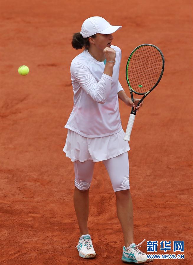 10月8日,斯维亚特克在比赛中庆祝得分。 当日,在法国巴黎进行的2020年法国网球公开赛女单半决赛中,波兰选手斯维亚特克以2比0战胜阿根廷选手波多罗斯卡,晋级决赛。 新华社记者高静摄