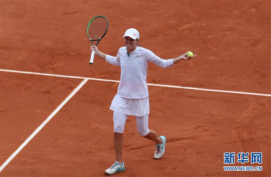 10月8日,斯维亚特克庆祝胜利。 当日,在法国巴黎进行的2020年法国网球公开赛女单半决赛中,波兰选手斯维亚特克以2比0战胜阿根廷选手波多罗斯卡,晋级决赛。 新华社记者高静摄