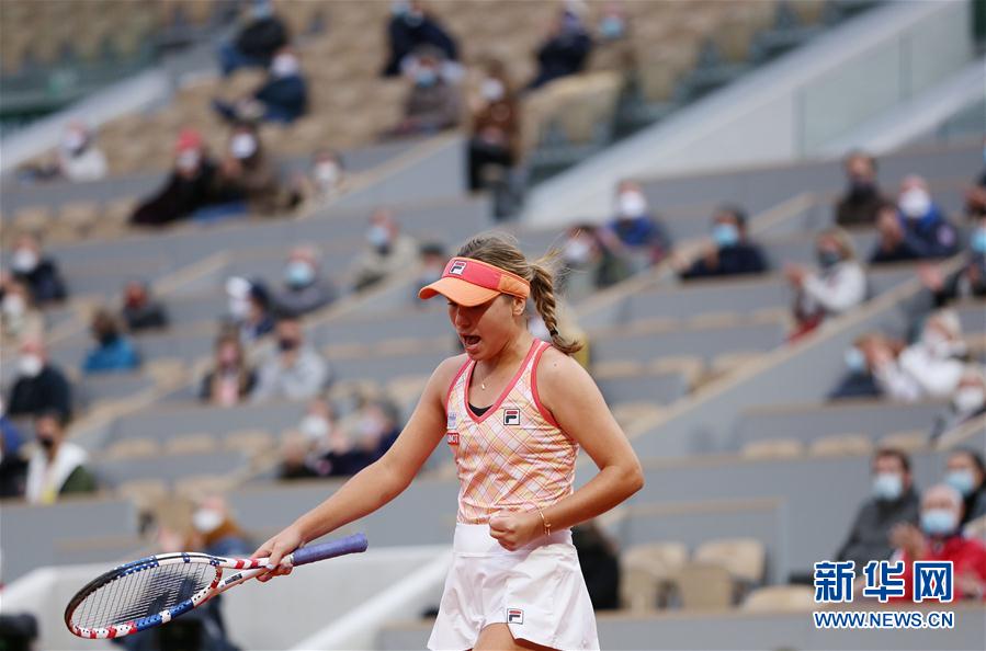 10月8日,克宁在比赛中庆祝得分。 当日,在法国巴黎进行的2020年法国网球公开赛女单半决赛中,美国选手克宁以2比0战胜捷克选手科维托娃,晋级决赛。 新华社记者高静摄