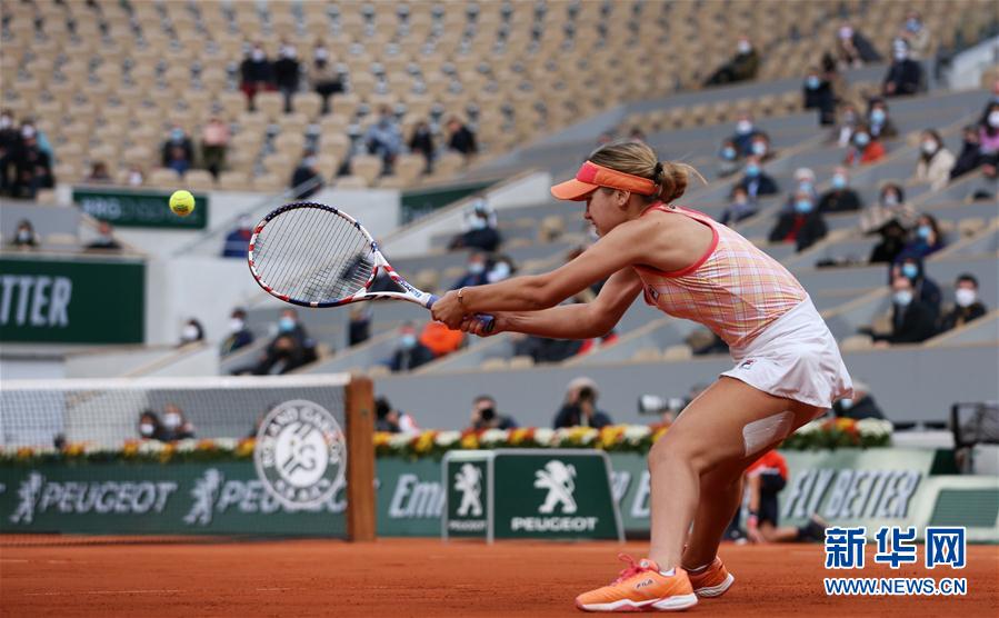 10月8日,克宁在比赛中回球。 当日,在法国巴黎进行的2020年法国网球公开赛女单半决赛中,美国选手克宁以2比0战胜捷克选手科维托娃,晋级决赛。 新华社记者高静摄
