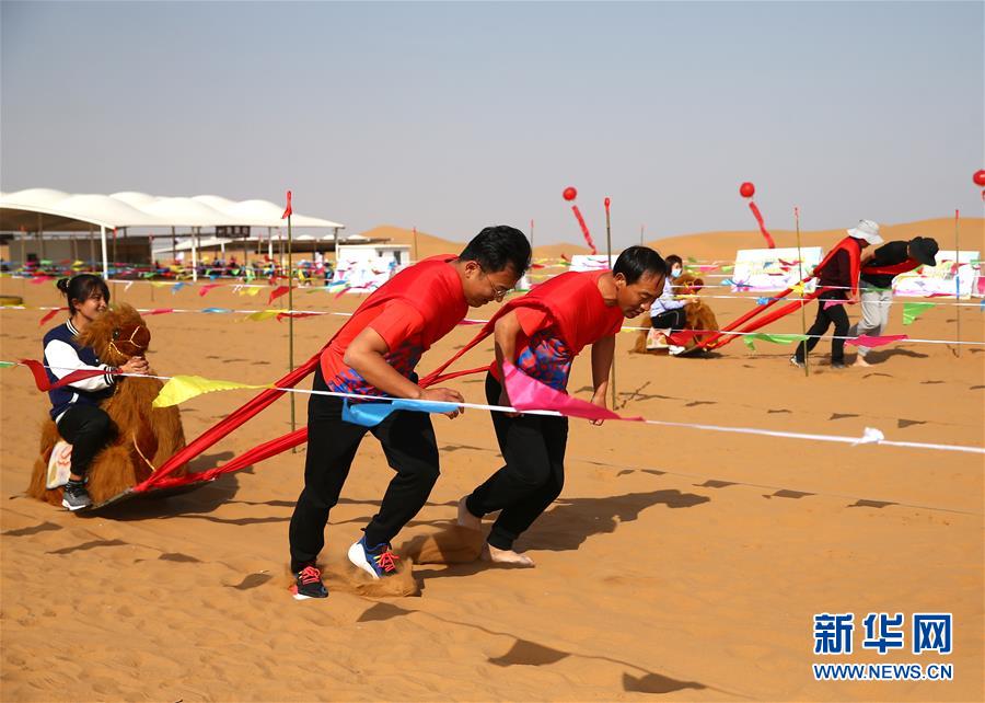 10月9日,选手在拉沙舟比赛中。 当日,2020宁夏回族自治区第二届大漠健身运动大赛在中卫市沙坡头景区内举行首日比赛。据了解,本届大赛共设置沙漠足球、沙漠软式排球、拉沙舟、沙漠木球等12个项目,吸引约800名选手参与其中,享受秋日运动之乐。 新华社记者 贾浩成 摄