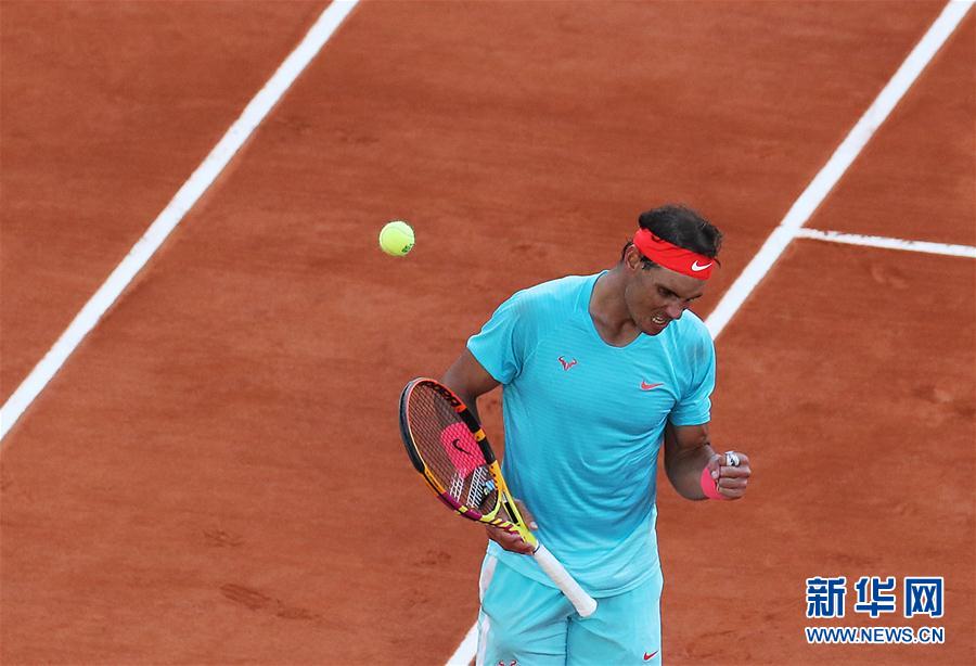 10月9日,纳达尔在比赛中庆祝得分。 当日,在法国巴黎进行的2020年法国网球公开赛男单半决赛中,西班牙选手纳达尔以3比0战胜阿根廷选手施瓦茨曼,晋级决赛。 新华社记者 高静 摄