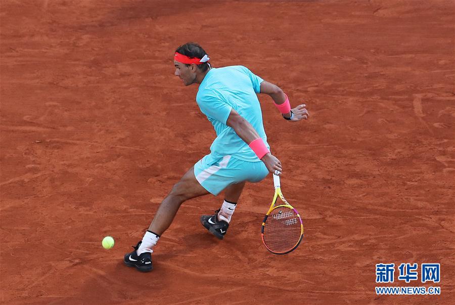 10月9日,纳达尔在比赛中。 当日,在法国巴黎进行的2020年法国网球公开赛男单半决赛中,西班牙选手纳达尔以3比0战胜阿根廷选手施瓦茨曼,晋级决赛。 新华社记者 高静 摄