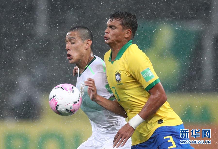 10月9日,巴西队球员蒂亚戈·席尔瓦(右)与玻利维亚队球员梅纳乔在比赛中拼抢。 当日,在2022年世界杯南美区预选赛首轮比赛中,巴西队以5比0战胜玻利维亚队。 新华社/法新