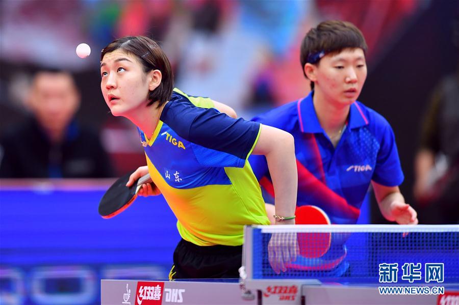 10月10日,陈梦(左)/王曼昱在比赛中。 当日,在山东威海举行的2020全国乒乓球锦标赛女子双打半决赛中,陈梦(山东)/王曼昱(黑龙江)组合以4比1战胜陈熠(上海地产集团)/蒯曼(江苏ZGL)组合,晋级决赛。 新华社记者 朱峥 摄