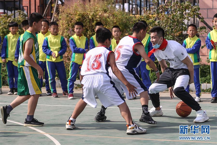 10月10日,辽宁男篮球员郭艾伦(右一)在与学生的对抗赛中运球。 当日,辽宁男篮主教练杨鸣与球员郭艾伦、张镇麟、刘雁宇来到沈阳市和平区砂山四校,给孩子们带来了一堂公益篮球课。 新华社记者 潘昱龙 摄