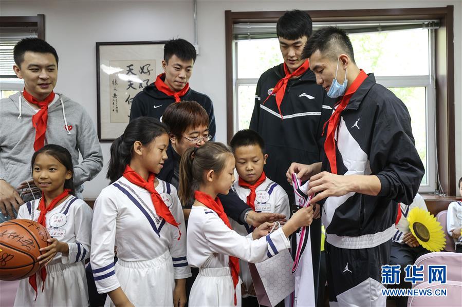 10月10日,辽宁男篮球员郭艾伦(右一)向学生赠送签名队服。 当日,辽宁男篮主教练杨鸣与球员郭艾伦、张镇麟、刘雁宇来到沈阳市和平区砂山四校,给孩子们带来了一堂公益篮球课。 新华社记者 潘昱龙 摄