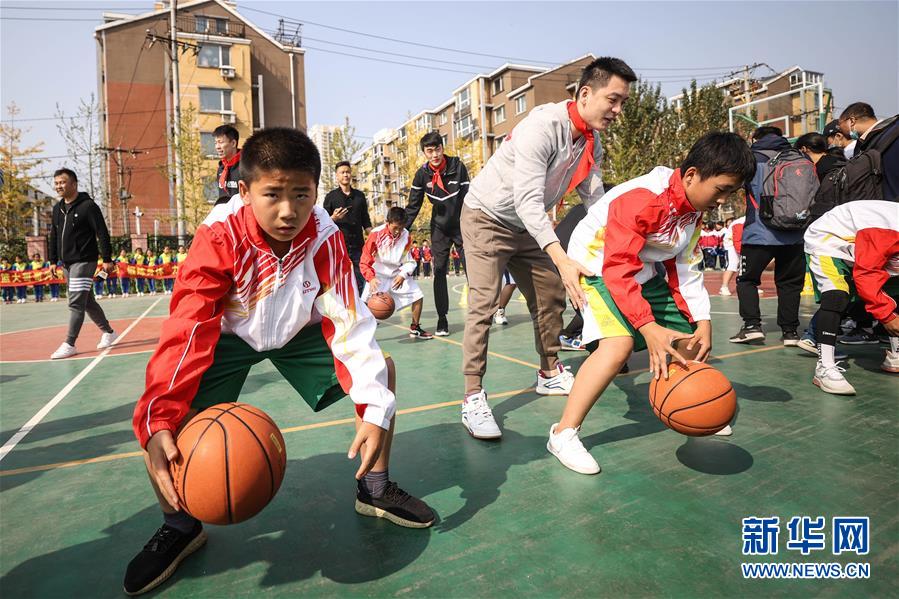 10月10日,辽宁男篮主教练杨鸣(前中)在指导学生运球动作。 当日,辽宁男篮主教练杨鸣与球员郭艾伦、张镇麟、刘雁宇来到沈阳市和平区砂山四校,给孩子们带来了一堂公益篮球课。 新华社记者 潘昱龙 摄