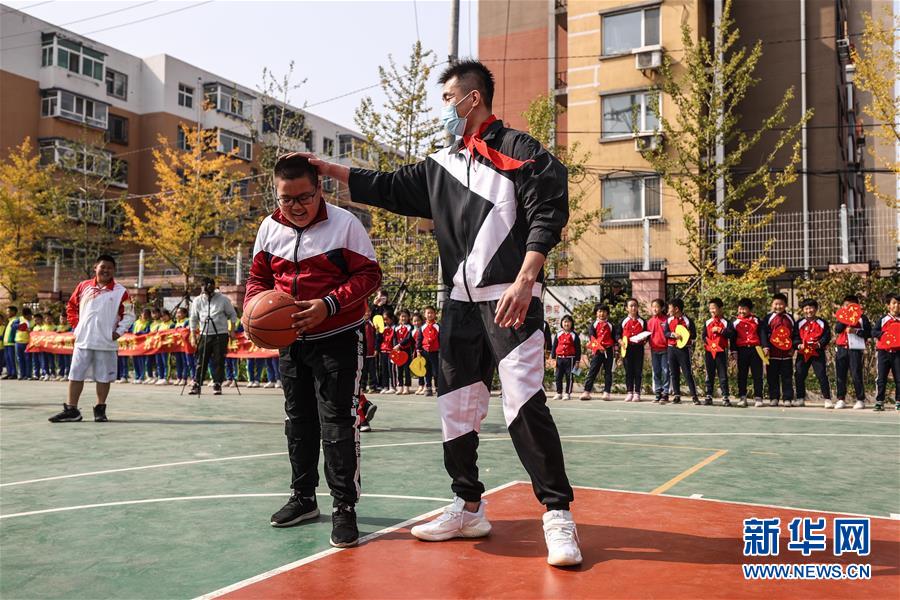 10月10日,辽宁男篮球员郭艾伦(右)与学生互动。 当日,辽宁男篮主教练杨鸣与球员郭艾伦、张镇麟、刘雁宇来到沈阳市和平区砂山四校,给孩子们带来了一堂公益篮球课。 新华社记者 潘昱龙 摄