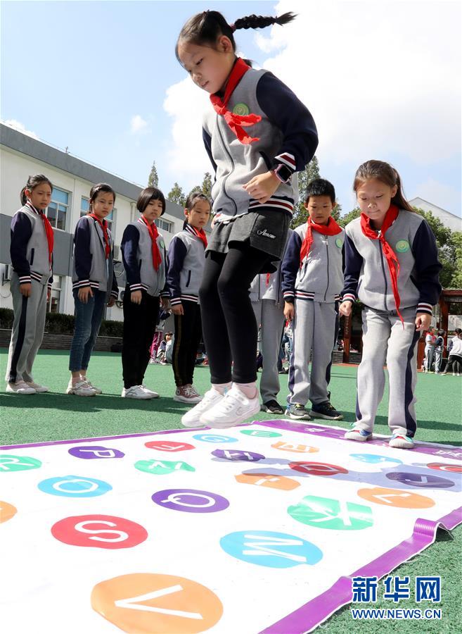 10月10日, 江苏省苏州市胥江中心小学的学生在大课间进行“字母跳”。 金秋时节,江苏省苏州市胥江中心小学利用大课间开展创意游戏健身活动,由全校学生自己评选出来的创意游戏项目帮助孩子们增加了户外运动量,增强了体质。 新华社发(杭兴微 摄)
