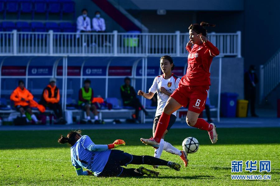 10月10日,河北华夏幸福队守门员王梦芊(下)在比赛中破坏广东梅州五华队球员谢绮文(右)的进攻。 当日,在2020年中国足球协会女子足球超级联赛第二阶段保级组第五轮比赛中,广东梅州五华队以4比0战胜河北华夏幸福队。 新华社记者胡超摄