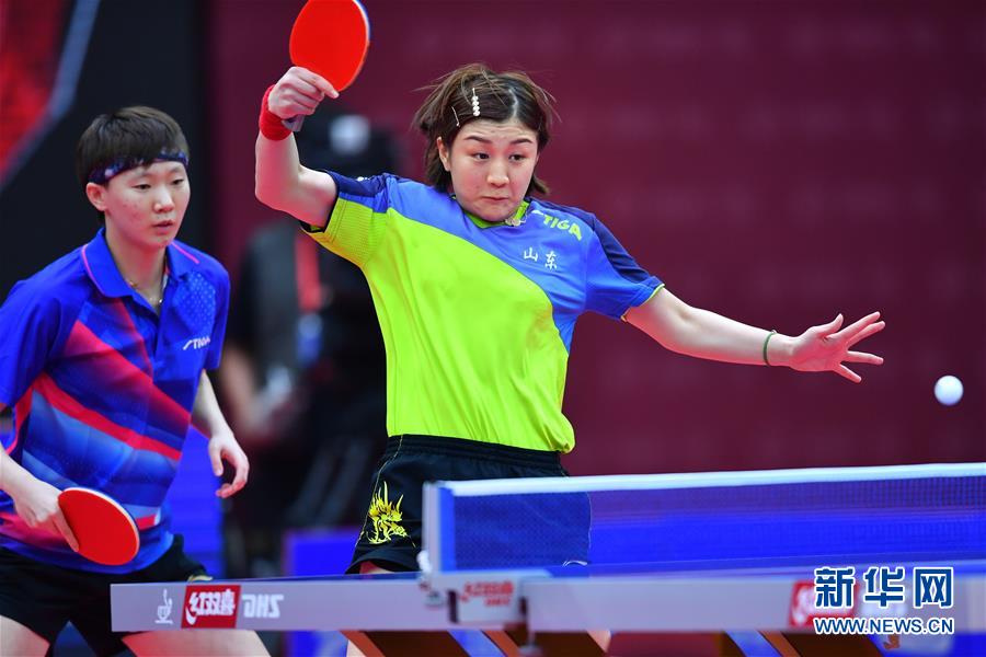 10月10日,陈梦(右)/王曼昱组合在比赛中。 当日,在山东威海举行的2020全国乒乓球锦标赛女子双打决赛中,陈梦(山东)/王曼昱(黑龙江)组合以4比3战胜孙颖莎(河北)/王艺迪(辽宁)组合,获得冠军。 新华社记者 朱峥 摄