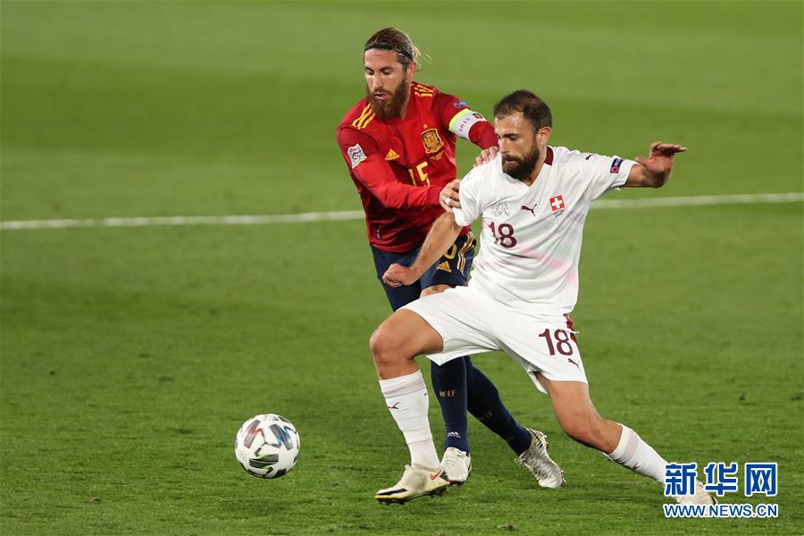 10月10日,西班牙队球员拉莫斯(左)在比赛中与瑞士队球员穆罕默迪拼抢。 当日,在西班牙马德里举行的欧洲国家足球联赛A级第四组第三轮比赛中,西班牙队主场以1比0战胜瑞士队。 新华社发(爱德华·皮特斯摄)