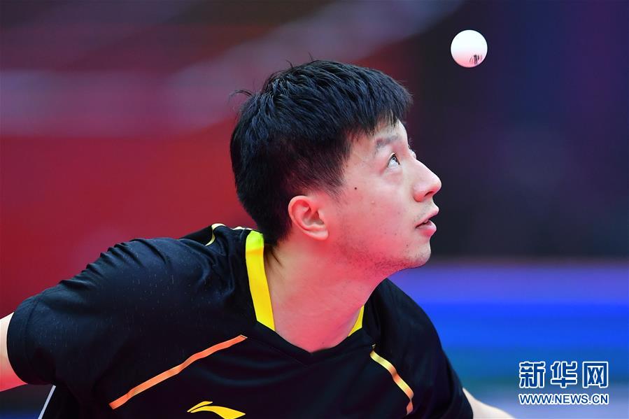 10月10日,马龙在比赛中发球。 当日,在山东威海举行的2020全国乒乓球锦标赛男子单打决赛中,樊振东以4比3战胜北京燕京啤酒队选手马龙,获得冠军。 新华社记者朱峥摄