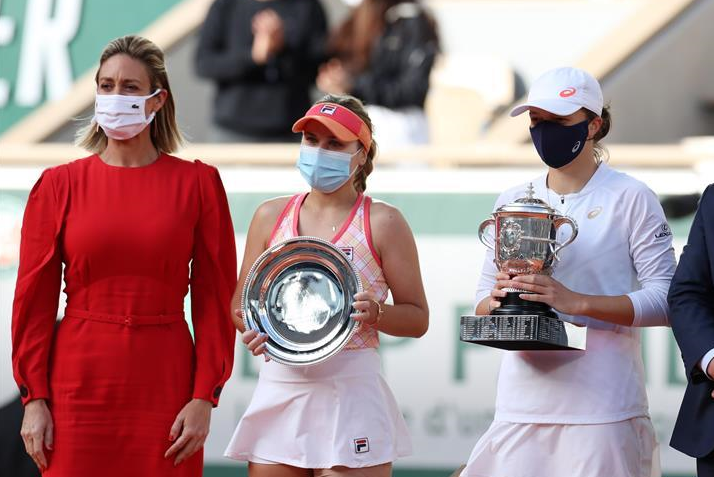 10月10日,斯维亚特克夺冠后在更衣室与奖杯合影。 当日,在法国巴黎进行的2020年法国网球公开赛女单决赛中,波兰选手斯维亚特克以2比0战胜美国选手克宁,夺得冠军。 新华社发(法国网球协会供图)