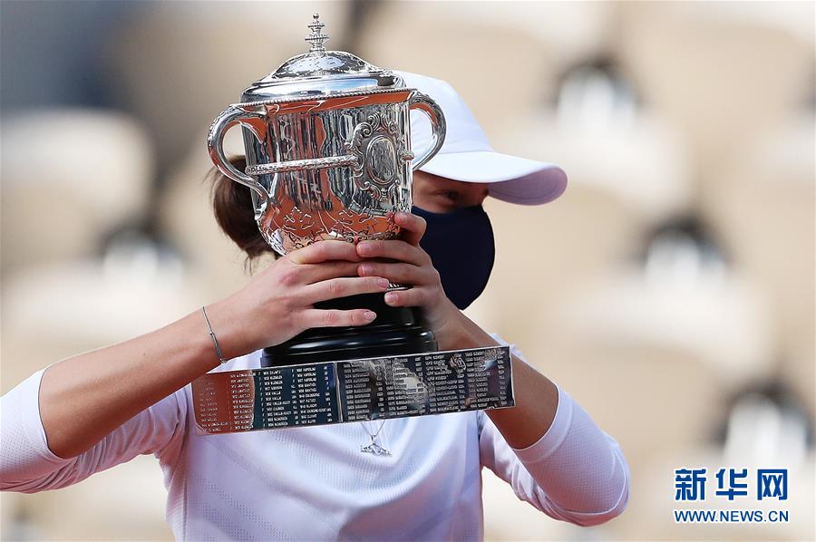 10月10日,斯维亚特克在颁奖仪式上举起奖杯庆祝。 当日,在法国巴黎进行的2020年法国网球公开赛女单决赛中,波兰选手斯维亚特克以2比0战胜美国选手克宁,夺得冠军。 新华社记者 高静 摄