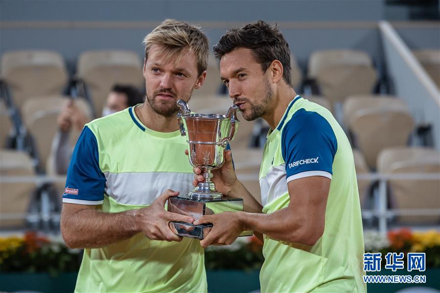 10月10日,克拉维茨/米斯(右)与冠军奖杯合影。 当日,在法国巴黎进行的2020年法国网球公开赛男子双打决赛中,德国组合克拉维茨/米斯以2比0战胜帕维奇(克罗地亚)/苏亚雷斯(巴西)组合,夺得冠军。 新华社发(奥雷利安·莫里萨尔摄)