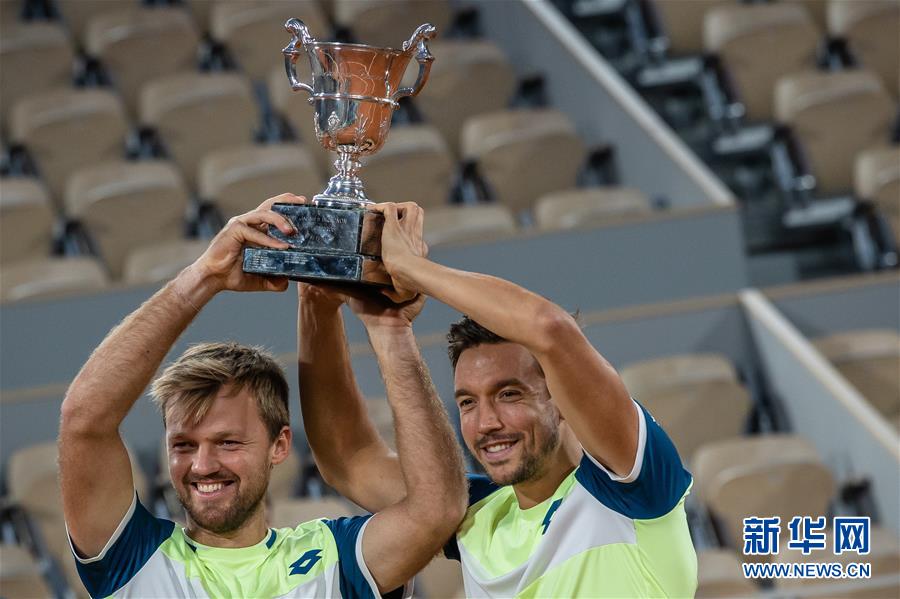 10月10日,克拉维茨/米斯(右)高举冠军奖杯。 当日,在法国巴黎进行的2020年法国网球公开赛男子双打决赛中,德国组合克拉维茨/米斯以2比0战胜帕维奇(克罗地亚)/苏亚雷斯(巴西)组合,夺得冠军。 新华社发(奥雷利安·莫里萨尔摄)