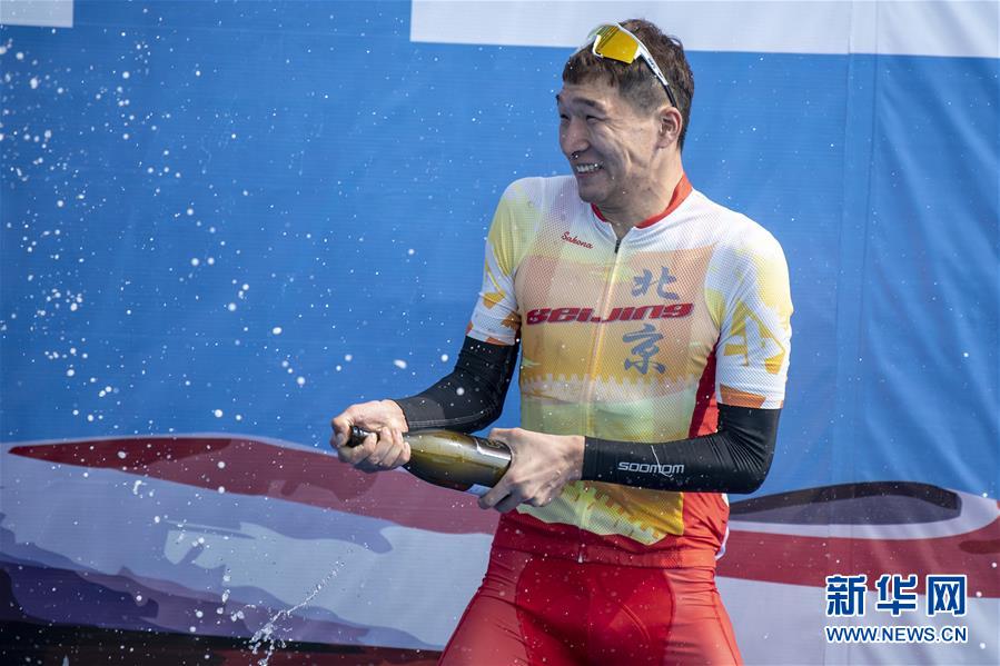 10月11日,北京-坤宝联合自行车队选手徐长泉在颁奖仪式上庆祝。他以2小时40分12秒的成绩取得第一赛段第一名。 当日,2020环太原公路自行车赛在山西省太原市拉开帷幕。首段比赛全长约97.2公里,共有来自全国各地的10支参赛队伍、120余名自行车运动员参赛。 新华社记者 杨晨光 摄