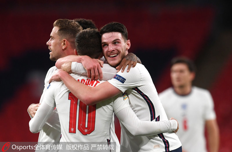 人民网北京10月12日电 北京时间今天凌晨0时,2020-2021赛季欧洲国家联赛A级B组第3轮上演一场焦点战役,英格兰坐镇温布利球场迎战比利时。上半场,比利时前锋卢卡库和英格兰前锋拉什福德先后点球破门。下半场,芒特破门帮助英格兰反超比分。最终英格兰2-1逆转击败比利时,英格兰升至小组积分榜榜首。