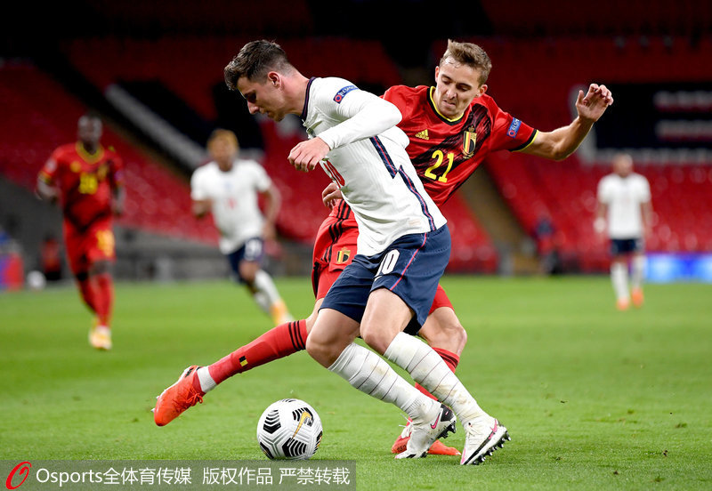 人民网北京10月12日电 北京时间今天凌晨0时,2020-2021赛季欧洲国家联赛A级B组第3轮上演一场焦点战役,英格兰坐镇温布利球场迎战比利时。上半场,比利时前锋卢卡库和英格兰前锋拉什福德先后点球破门。下半场,芒特破门帮助英格兰反超比分。最终英格兰2-1逆转击败比利时,英格兰升至小组积分榜榜首。
