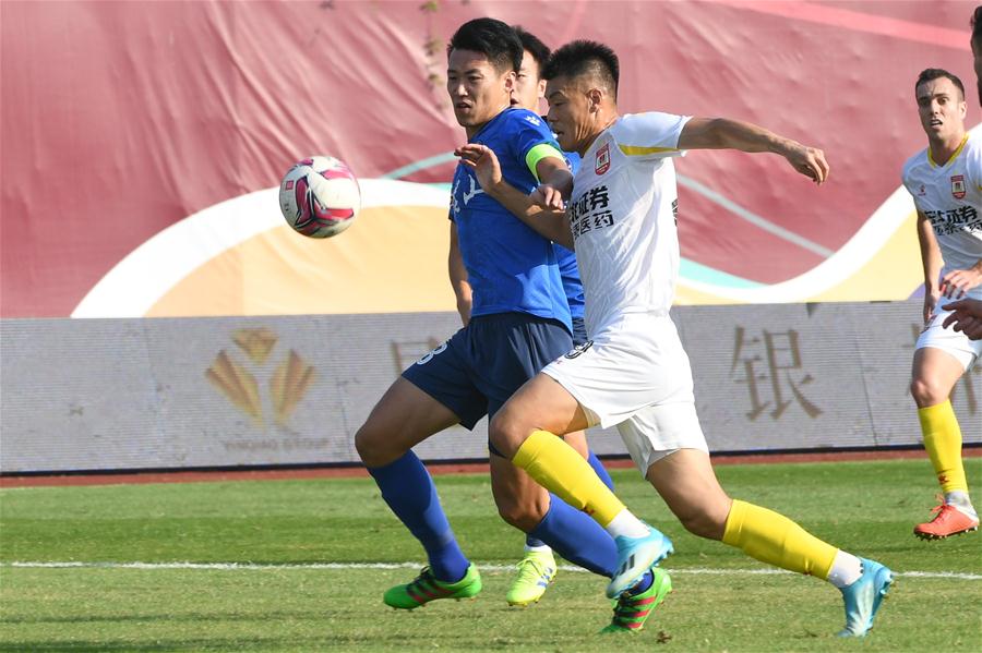 10月11日,昆山FC队球员汪佳捷(左一)在比赛中与长春亚泰队球员谭龙拼抢。 当日,在2020中国足球协会甲级联赛第一阶段(常州赛区)第九轮比赛中,长春亚泰队以3比1战胜昆山FC队。 新华社发(史康 摄)