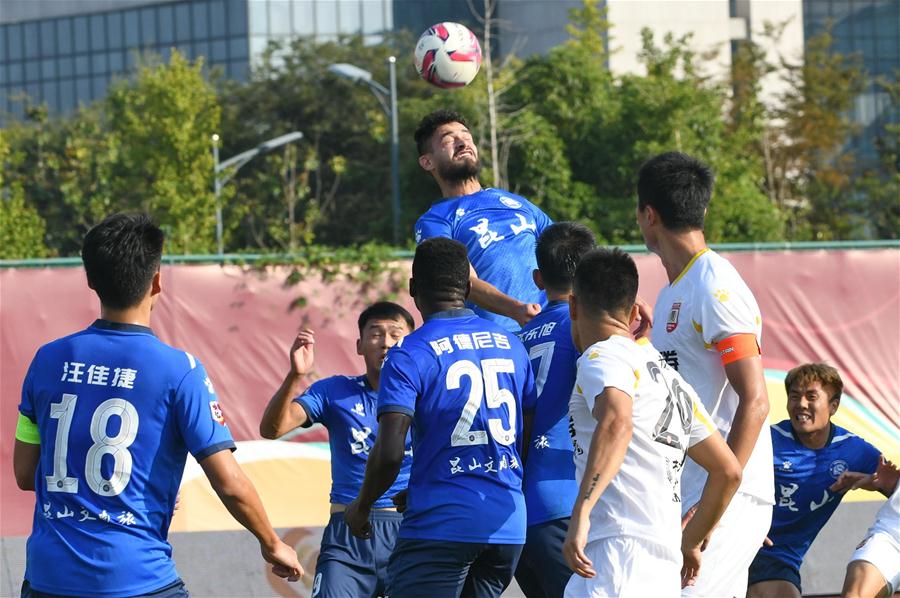 10月11日,昆山FC队球员皮里(上)在比赛中争顶头球。 当日,在2020中国足球协会甲级联赛第一阶段(常州赛区)第九轮比赛中,长春亚泰队以3比1战胜昆山FC队。 新华社发(史康 摄)