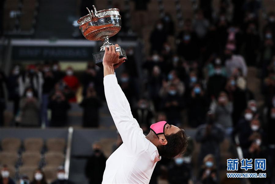10月11日,在2020法国网球公开赛男单决赛中,“红土之王”纳达尔横扫头号种子焦科维奇,第13次在罗兰加洛斯加冕男单冠军,并追平了瑞士人费德勒保持的20次大满贯夺冠的男子纪录。 图为2020年10月11日,纳达尔在颁奖仪式上高举奖杯庆祝。当日,在2020年法国网球公开赛男单决赛中,西班牙选手纳达尔以3比0战胜塞尔维亚选手焦科维奇,第13次获得法网男单冠军。 新华社记者高静摄