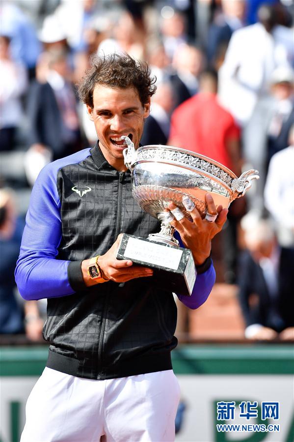 10月11日,在2020法国网球公开赛男单决赛中,“红土之王”纳达尔横扫头号种子焦科维奇,第13次在罗兰加洛斯加冕男单冠军,并追平了瑞士人费德勒保持的20次大满贯夺冠的男子纪录。 图为2017年6月11日,纳达尔在颁奖仪式上。当日,在法国巴黎举行的2017法国网球公开赛男子单打决赛中,西班牙选手纳达尔以3比0战胜瑞士选手瓦林卡,第11次获得法网男单冠军。 新华社记者陈益宸摄