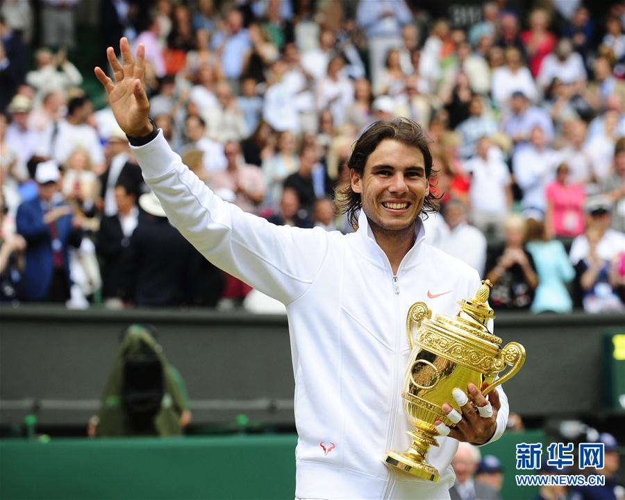 10月11日,在2020法国网球公开赛男单决赛中,“红土之王”纳达尔横扫头号种子焦科维奇,第13次在罗兰加洛斯加冕男单冠军,并追平了瑞士人费德勒保持的20次大满贯夺冠的男子纪录。 图为2010年7月4日,纳达尔在颁奖仪式上。当日,西班牙选手纳达尔在2010年温布尔登网球公开赛男单决赛中,以3比0击败捷克选手伯蒂奇,第二次夺得温网男单冠军。 新华社记者曾毅摄