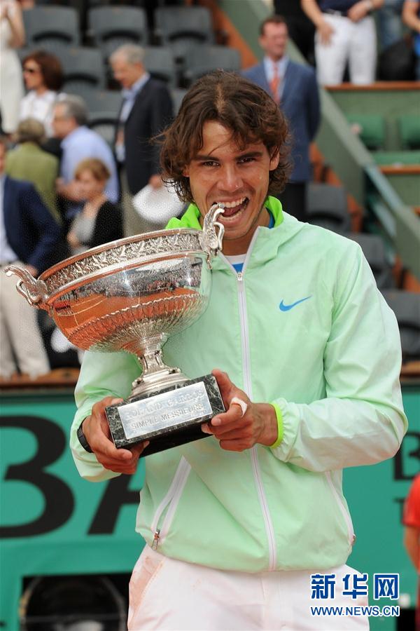 10月11日,在2020法国网球公开赛男单决赛中,“红土之王”纳达尔横扫头号种子焦科维奇,第13次在罗兰加洛斯加冕男单冠军,并追平了瑞士人费德勒保持的20次大满贯夺冠的男子纪录。 图为2010年6月6日,纳达尔在颁奖仪式上庆祝。当日,在2010年法国网球公开赛男单决赛中,西班牙选手纳达尔以3比0战胜瑞典选手索德林,第五次获得法网男单冠军。 新华社发(洛朗摄)