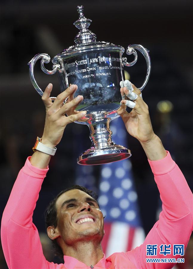 10月11日,在2020法国网球公开赛男单决赛中,“红土之王”纳达尔横扫头号种子焦科维奇,第13次在罗兰加洛斯加冕男单冠军,并追平了瑞士人费德勒保持的20次大满贯夺冠的男子纪录。 图为2017年9月10日,纳达尔在颁奖仪式上高举奖杯庆祝。当日,在2017美国网球公开赛男单决赛中,西班牙选手纳达尔以3比0战胜南非选手安德森,第三次夺得美网男单冠军。 新华社记者王迎摄