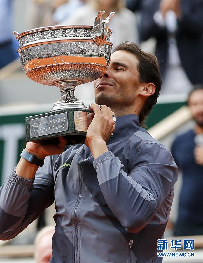 10月11日,在2020法国网球公开赛男单决赛中,“红土之王”纳达尔横扫头号种子焦科维奇,第13次在罗兰加洛斯加冕男单冠军,并追平了瑞士人费德勒保持的20次大满贯夺冠的男子纪录。 图为2019年6月9日,纳达尔在颁奖仪式上庆祝。当日,在2019年法国网球公开赛男单决赛中,西班牙选手纳达尔以3比1战胜奥地利选手蒂姆,第12次获得法网男单冠军。 新华社记者韩岩摄