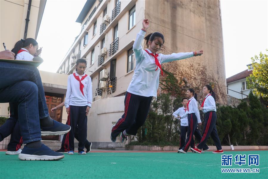 10月12日,上海市位育初级中学学生在立定跳远比赛中。 当日,“2020年位育初级中学体育节”在上海市位育初级中学举行。此次体育节有约1200名学生参加,设置了立定跳远、实心球以及跳绳等共十个项目,旨在调动学生们的运动积极性,养成科学锻炼的习惯。 新华社记者 丁汀 摄