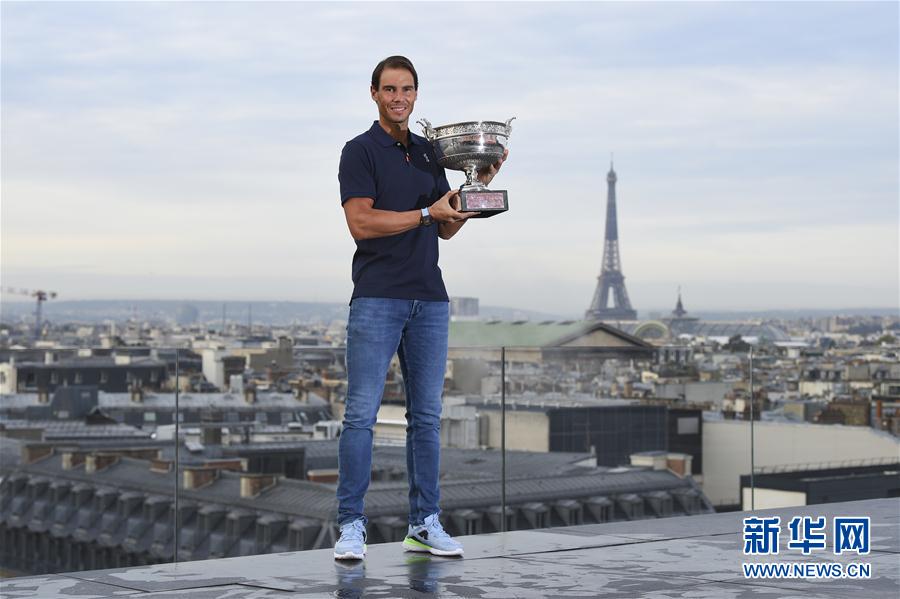 10月12日,2020年法网男单冠军纳达尔与奖杯合影。 10月11日,在法国巴黎进行的2020年法国网球公开赛男单决赛中,西班牙选手纳达尔以3比0战胜塞尔维亚选手焦科维奇,夺得冠军。 新华社发(法国网球协会供图)