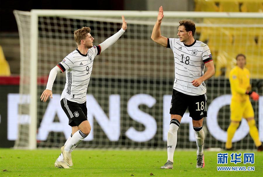 10月13日,德国队球员维尔纳(左)进球后与队友格雷茨卡一同庆祝。 当日,在德国科隆举行的欧足联国家足球联赛A级第四组第四轮的比赛中,德国队主场以3比3战平瑞士队。 新华社发