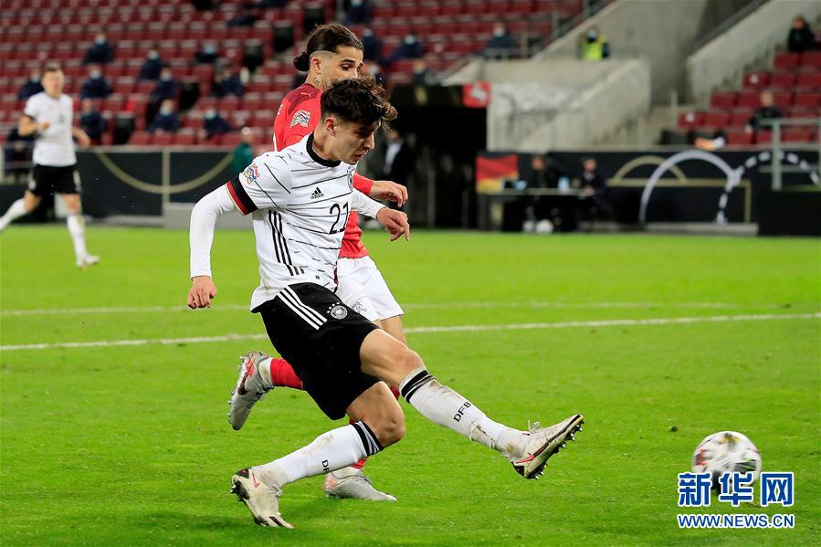 10月13日,德国队球员哈弗茨(前)在比赛中射门。 当日,在德国科隆举行的欧足联国家足球联赛A级第四组第四轮的比赛中,德国队主场以3比3战平瑞士队。 新华社发