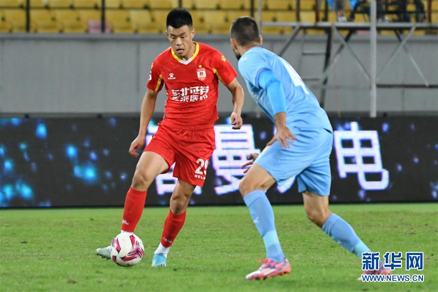10月14日,长春亚泰队球员谭龙(左)在比赛中带球进攻。 当日,在2020中国足球协会甲级联赛第一阶段(常州赛区)第10轮比赛中,长春亚泰队以1比1战平四川优必选队。 新华社发(史康 摄)