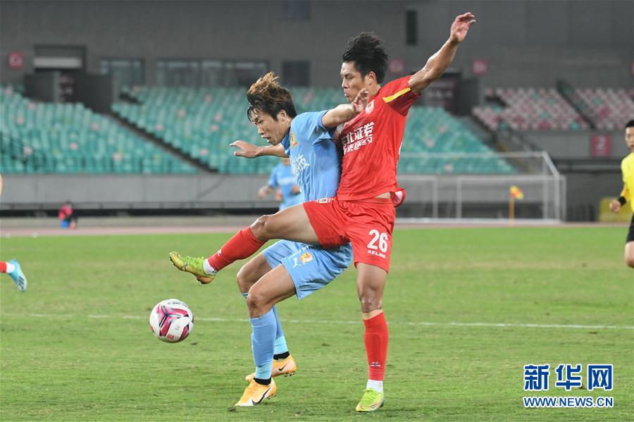 10月14日,长春亚泰队球员杨超声(右)在比赛中拼抢。 当日,在2020中国足球协会甲级联赛第一阶段(常州赛区)第10轮比赛中,长春亚泰队以1比1战平四川优必选队。 新华社发(史康 摄)