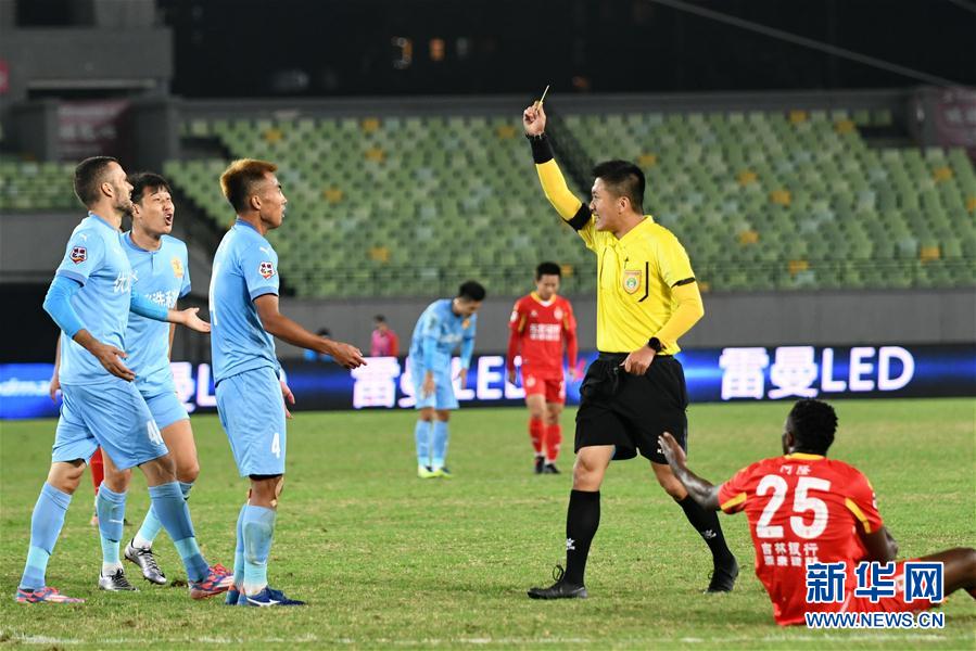 10月14日,主裁判刘欣宇(右二)向四川优必选队球员王峤(左三)出示黄牌。 当日,在2020中国足球协会甲级联赛第一阶段(常州赛区)第10轮比赛中,长春亚泰队以1比1战平四川优必选队。 新华社发(史康 摄)