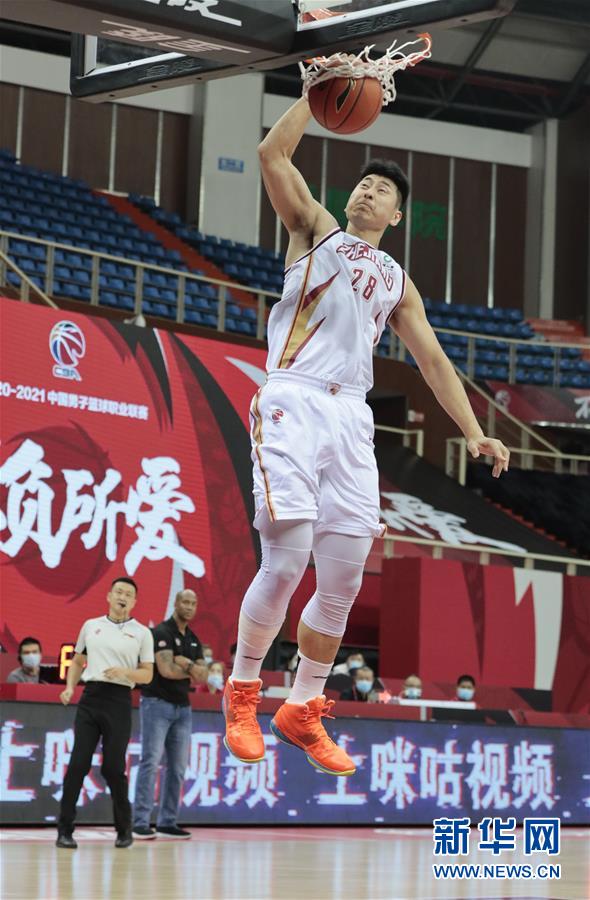 10月15日,浙江稠州金租队球员张正昕在比赛中扣篮。 当日,在浙江省诸暨市举行的2020-2021赛季中国男子篮球职业联赛(CBA)季前赛中,浙江稠州金租队以89比68战胜北京紫禁勇士队。 新华社发(郭斌 摄)