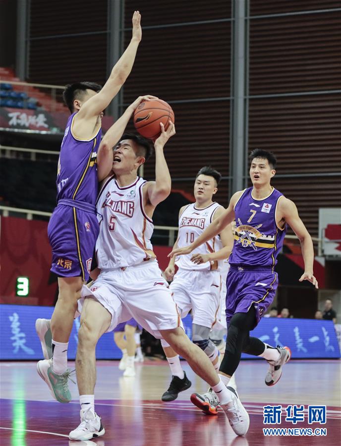 10月15日,浙江稠州金租队球员林孝天(左二)在比赛中带球进攻。 当日,在浙江省诸暨市举行的2020-2021赛季中国男子篮球职业联赛(CBA)季前赛中,浙江稠州金租队以89比68战胜北京紫禁勇士队。 新华社发(郭斌 摄)